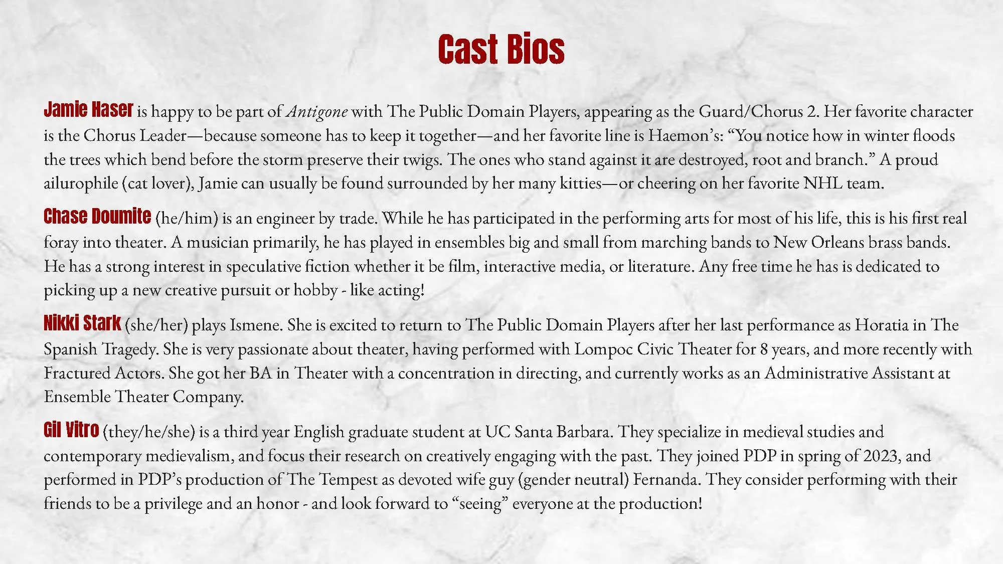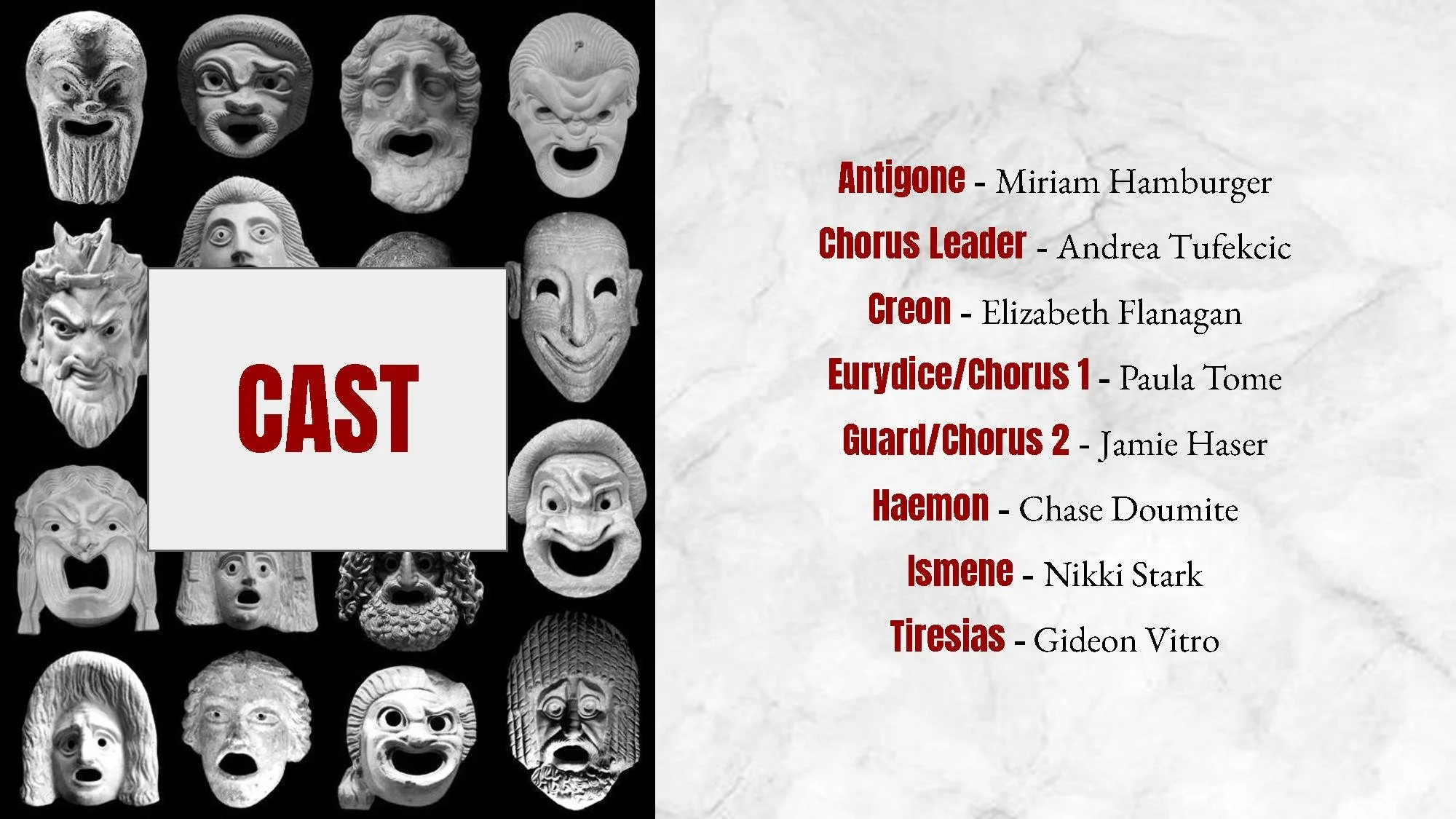 In the aftermath of civil war, King Creon institutes an order barring the burial of Antigone's rebellious brother. In defiance, Antigone performs the burial rites and claims Creon's proclamation to be against the laws of the gods. The act shakes the foundations of civil life and prompts the questions: Who has control over life and death? What do we owe to the dead?